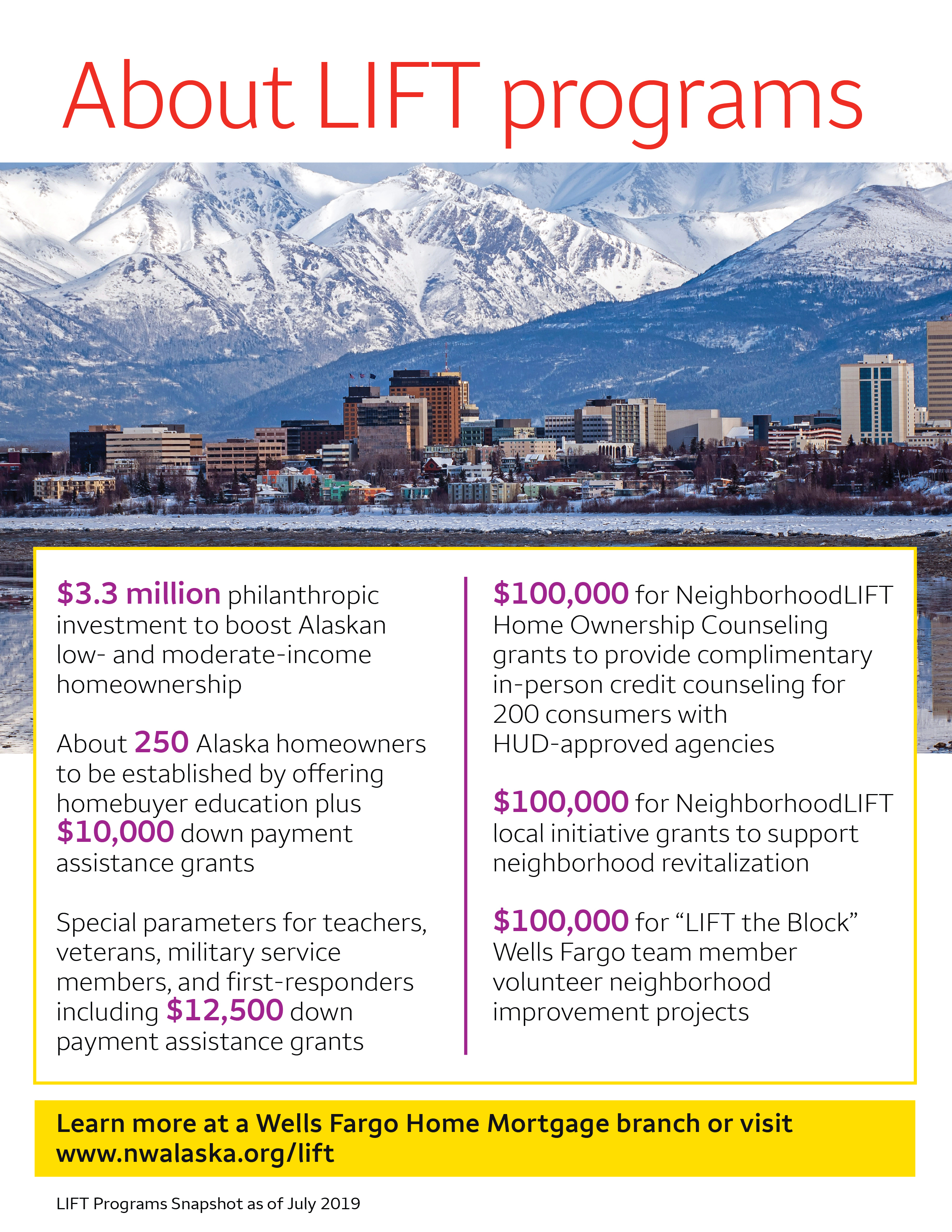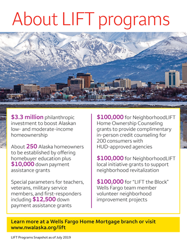 The Wells Fargo Alaska NeighborhoodLIFT program will begin offering $10,000 down payment assistance grants on Monday, Aug. 12, to eligible homebuyers. To learn more about the eligibility requirements, visit www.nwalaska.org/lift or visit a local Wells Fargo Home Lending office. Participating homebuyers can obtain mortgage financing from any participating lender, and NeighborWorks Alaska HomeOwnership Center will determine eligibility and administer the down payment assistance grants.