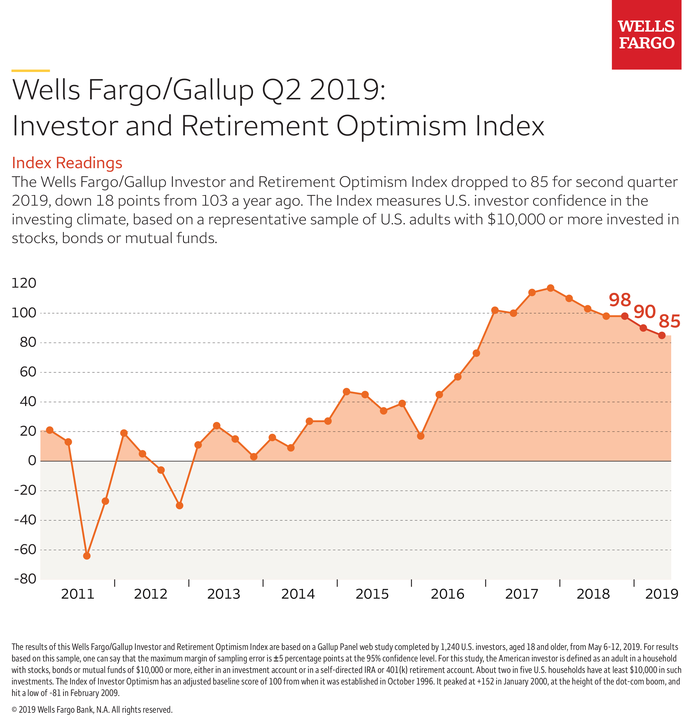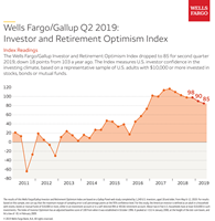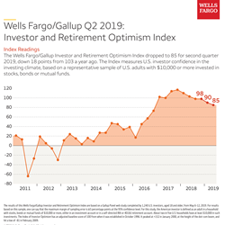 SAN FRANCISCO--(BUSINESS WIRE)--The Wells Fargo/Gallup Investor and Retirement Optimism Index dropped to 85 for second quarter 2019, down 18 points from 103 a year ago. Investors are less optimistic than a year ago about maintaining their household income and reaching their 12-month and five-year investing goals.