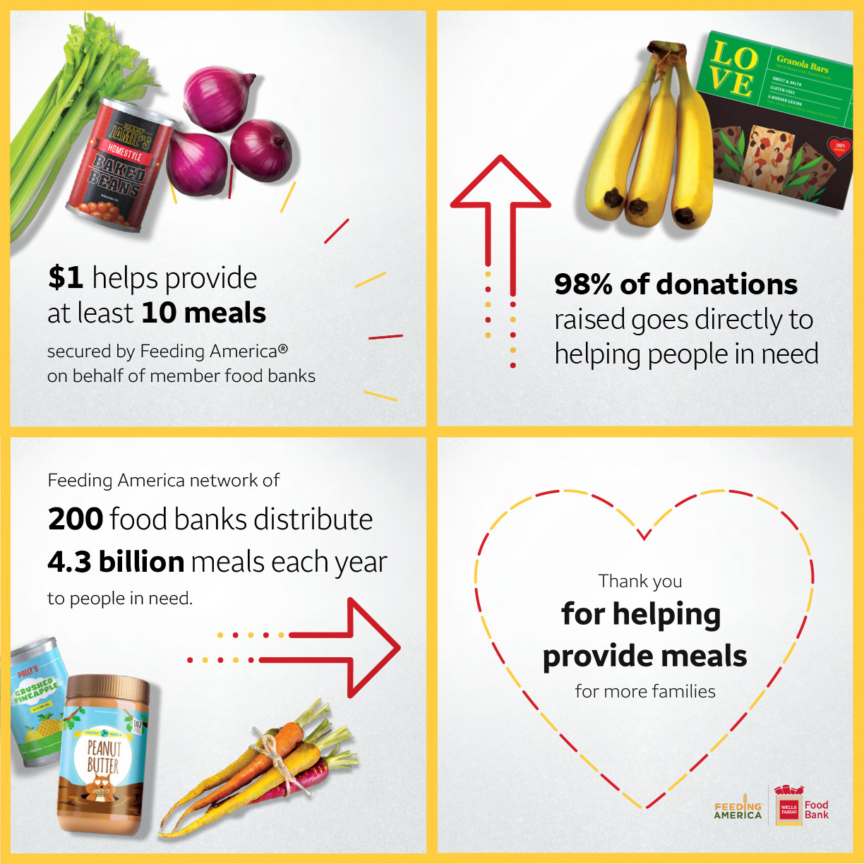 Building upon the success of last year’s Holiday Food Bank program, which helped to provide more than 55 million meals, Wells Fargo encourages customers, team members and community members to join in this year’s effort to help make more meals possible during the holidays.