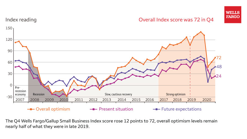 The Q4 Wells Fargo/Gallup Small Business Index score rose 12 points to 72, overall optimism levels remain nearly half of what they were in late 2019. (Graphic: Wells Fargo)