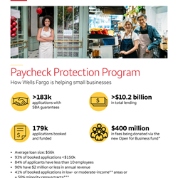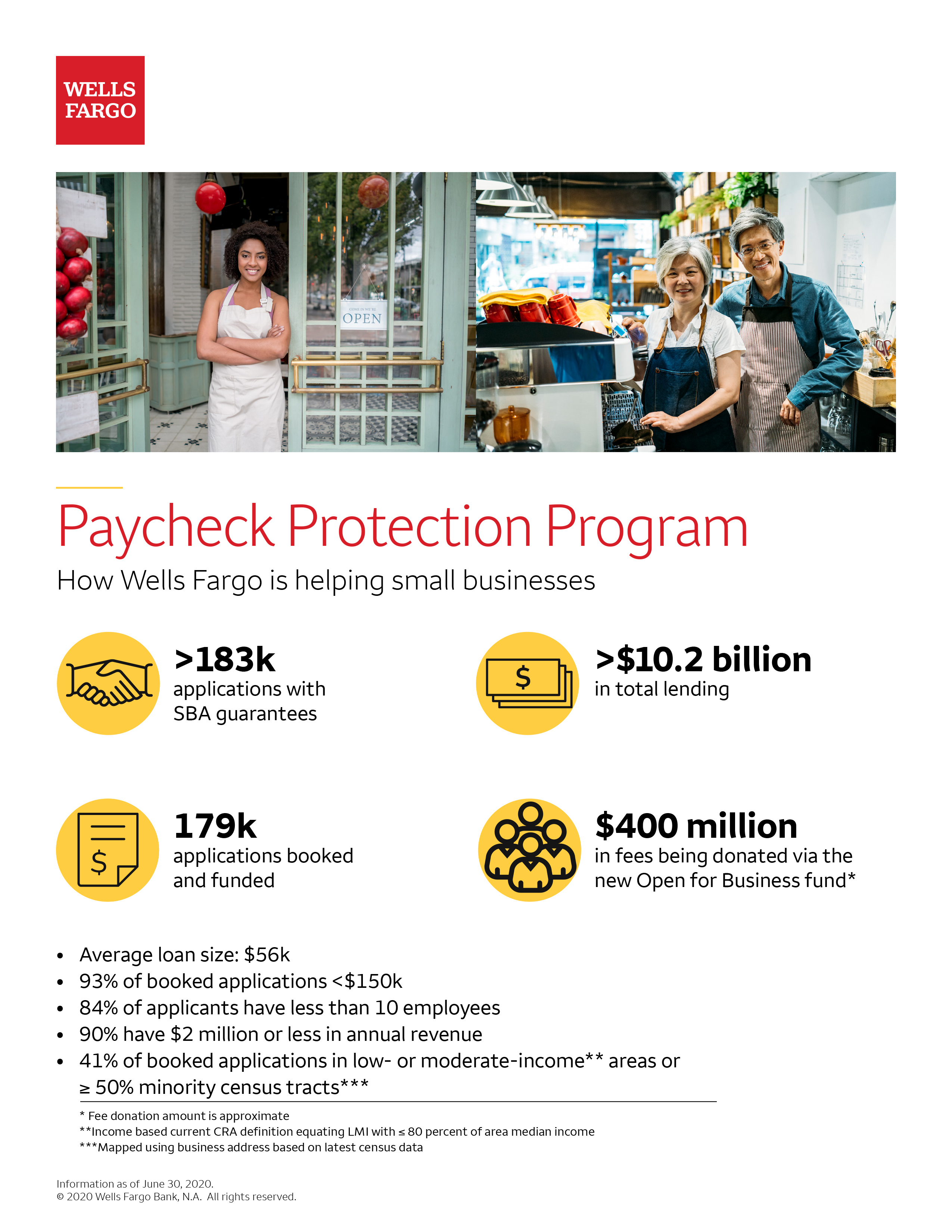 Through June 30, Wells Fargo funded loans under the PPP for more than 179,000 customers, with an average loan amount of $56,000, totaling $10.1 billion. Of the loans made, 84% of those are for companies that have less than 10 employees; 60% were for amounts of $25,000 or less; and, 90% of these applicants had $2 million or less in annual revenue. Given the federal government’s extension of the PPP, Wells Fargo will reopen its PPP loan application process to eligible customers as soon as possible through a link in Business Online Banking