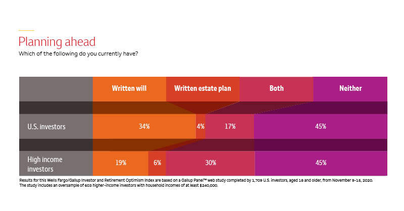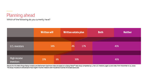 The global focus on COVID-19 over the past year has caused people to evaluate aspects of financial security that they may have previously put off — most importantly, creating a will and an estate plan. But the Q4 Wells Fargo/Gallup Investor and Retirement Optimism Index shows that while some progress has been made in this area, many investors have more work to do. Close to half of investors in the new survey (45%) report they have neither a will nor an estate plan. About a third say they do have a written will (34%), 4% have written estate plans, and 17% have both.