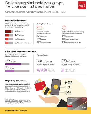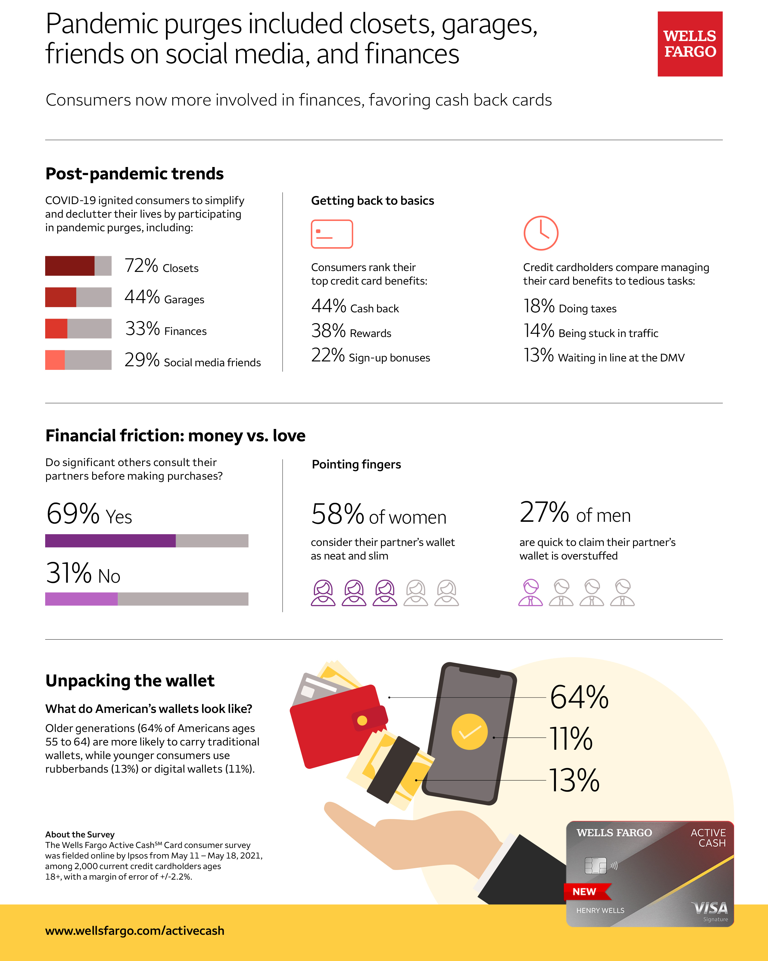 According to a Wells Fargo Active Cash Card survey, the COVID-19 pandemic prompted two-thirds (63%) of credit card-holding consumers to initiate “pandemic purges.” When looking at what exactly consumers decluttered, the survey found that three-quarters (72%) decluttered their closets, one-third (29%) purged their friends on social media, and another one-third (33%) simplified and decluttered their finances. Coming out of the pandemic, more than one-third (36%) of consumers surveyed say they are becoming more involved in money management, gaining enhanced perspective on their financial standing and goals.
