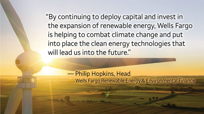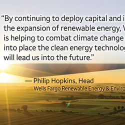 “Wells Fargo uses its tax capacity in a meaningful way to invest in projects that contribute to the nation’s acceleration toward a low-carbon economy,” said Philip Hopkins, head of Wells Fargo Renewable Energy & Environmental Finance, a part of Wells Fargo Commercial Capital. “We are proud to play a key role in the growth of this important industry, and honored to work closely with so many leading sponsors and developers of wind and solar energy projects.”
